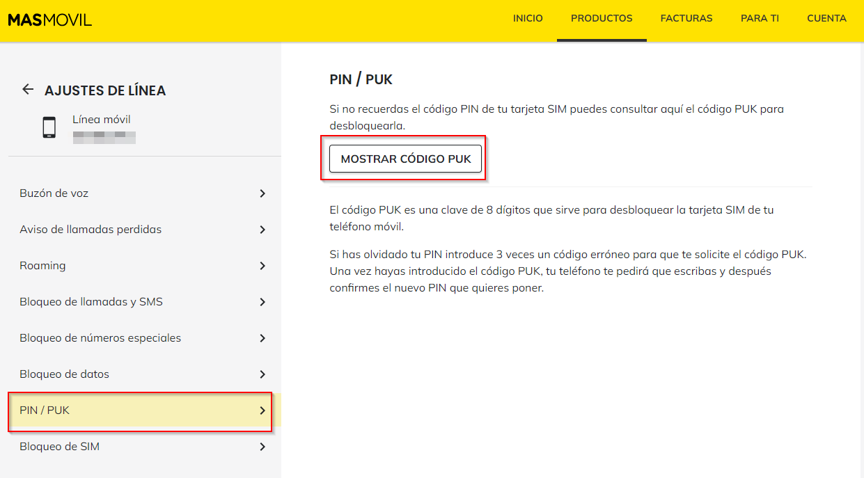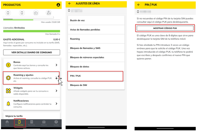 introduce un PIN erróneo 3 veces, se bloqueará la SIM y necesitarás el PUK para desbloquearla. Este lo puedes encontrar accediendo a tu área privada en la sección: líneas o productos > Roaming y ajustes > Código PUK.