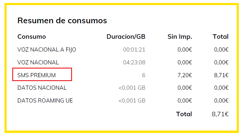 Para que puedas controlar mejor lo que te aparece en tu factura, cada vez que hagas un consumo de “Mensajes de texto (SMS) Premium”, el cual no está incluido dentro tu tarifa te enviaremos un SMS (si has realizado consumos superiores a los 3€), para informarte y así evitarte sorpresas inesperadas al pasar el cobro.