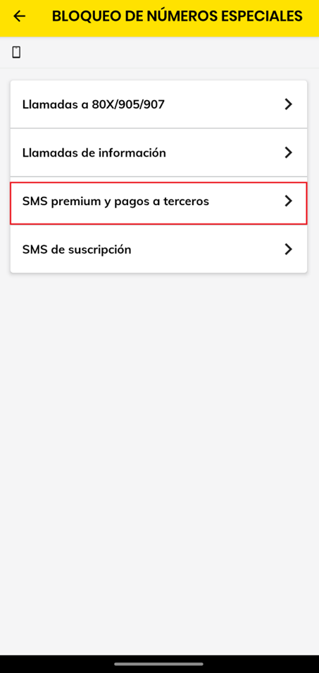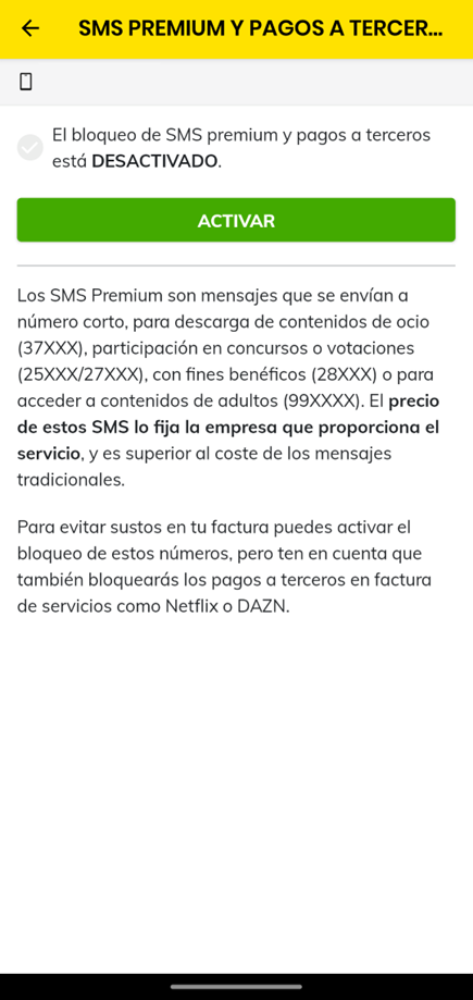 Accede a tu área de cliente> Selecciona la línea que quieres gestionar en Producto > Entra en Roaming y Ajustes > Luego en SMS Premium y pagos a terceros > Activa o desactiva el servicio pulsando el botón.